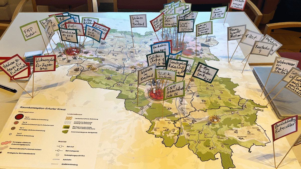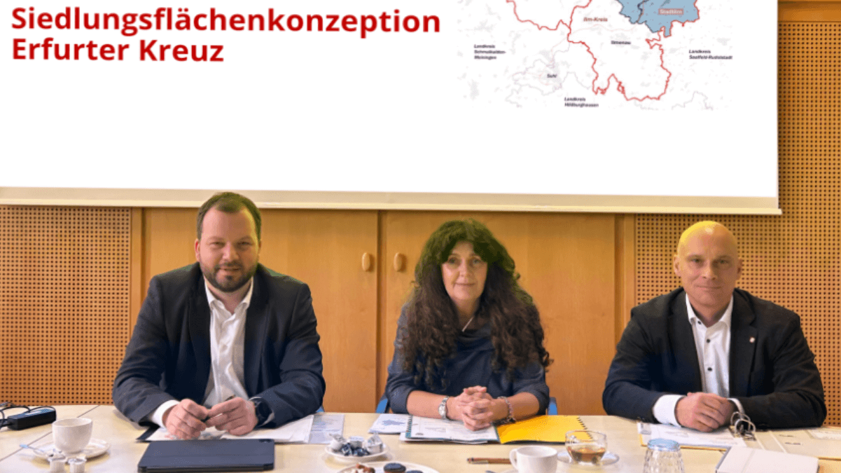 Anfang 2026 wurden aktuelle Entwicklungen rund um das Umsetzungsmanagement der Siedlungsflächenkonzeption Erfurter Kreuz besprochen. Themen waren unter anderem neue Rahmenbedingungen wie der sogenannte Bauturbo, Vorgaben zum geförderten Wohnraum sowie die Präsenz der Kooperation auf Fachveranstaltungen.